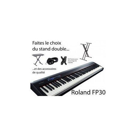 Piano numérique ROLAND FP30X B (noir) ou WH (blanc) fournit en pack avec un stand X, une banquette pliable et un casque de qualité.